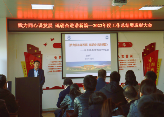 随后,院长王康军代表学院领导班子做了题为“勠力同心谋发展 砥砺奋进谱新篇”的报告。他指出,2022年,学院始终坚持以习近平新时代中国特色社会主义思想为指导,深入贯彻党的二十大精神,以国家战略需求为导向,紧紧围绕学校新发展阶段的使命愿景,高标定位、精准发力,注重实效、狠抓落实,在党建、学科建设、科学研究、人才培养、对外交流等方面取得了丰硕的成果,高质量完成全年目标任务。在党建方面,学院党委荣获“全省党建工作标杆院系”“全国党建工作样板支部”“辽宁省党支部标准化规范化建设示范点”;在学科建设方面,化学工程与技术学科在上一轮学科评估获得“B”的基础上实现新的突破,同时化学工程与技术一级学科博士授权点成功通过国务院学位委员会组织的核查,2023年能够开展招生和培养;此外,在科学研究、人才培养、招生就业、社会服务以及对外交流等方面也取得了突破性进展。